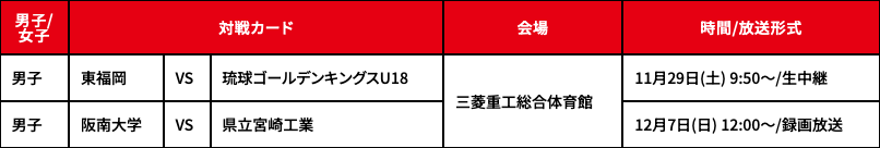 対象となる試合は、「U18日清食品ブロックリーグ2025 グループH」の2試合です。部活とクラブの垣根を越えた熱戦が繰り広げられる東福岡対琉球U18の一戦に加えて、本日時点で無敗のチーム同士である阪南大学と県立宮崎工業が激突します。両チームとも惜しくも冬の全国大会への切符は途絶えてしまいましたが、「U18日清食品トップリーグ2026入替戦」への出場権も懸かる本大会におけるグループ優勝を目指して全力勝負に臨みます。本大会を通じた、U18世代の新たな真剣勝負にご注目ください。