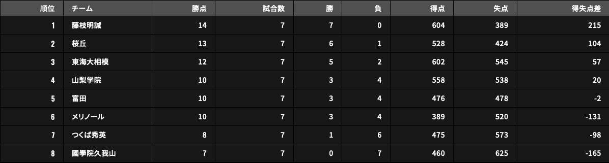 全7試合で大差をつけて対戦チームを圧倒した藤枝明誠高等学校 (静岡県)が、7勝0敗で全勝優勝を果たし、6勝1敗の桜丘高等学校 (愛知県) が準優勝となりました。