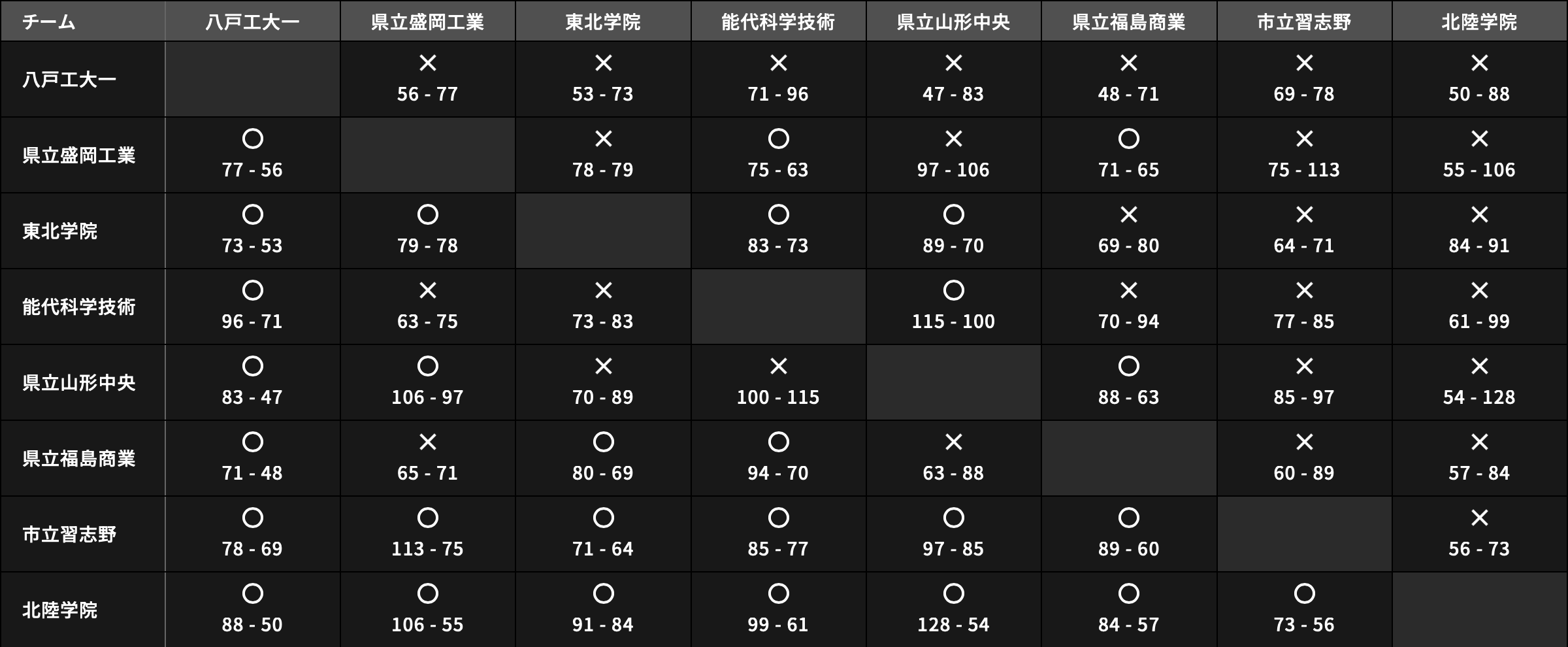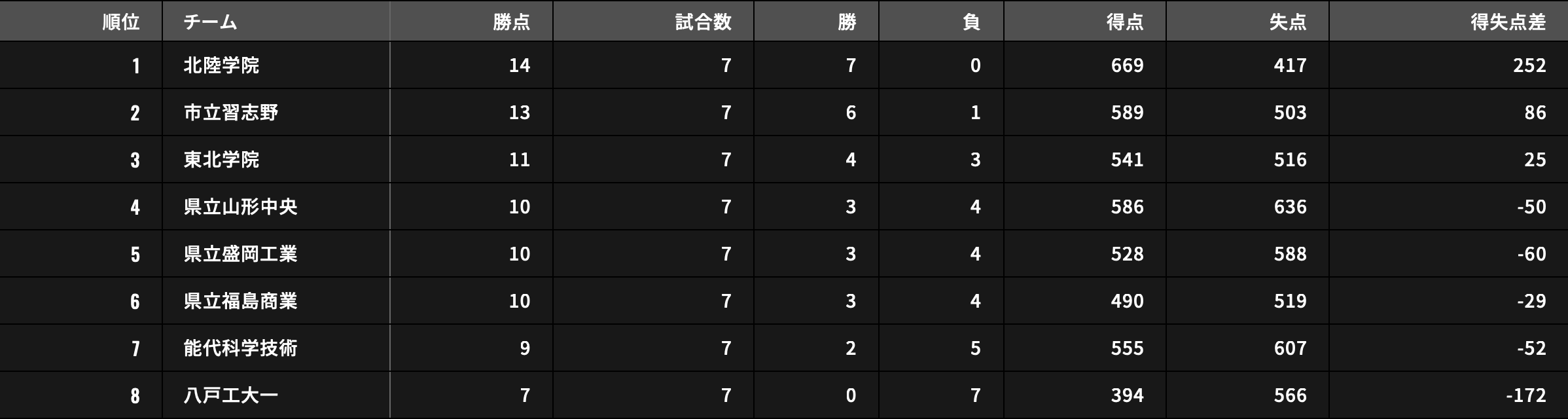 東北ブロックの各代表チームがひしめき合うグループで、垣根を越えて参戦した2チームである北陸学院高等学校(石川県)が並みいる強豪を退け7勝0敗で優勝、市立習志野高等学校 (千葉県) が準優勝を決定いたしました。なお、本大会の成績に伴い、北陸学院高等学校は 「U18日清食品ブロックリーグ2026」 の出場権を獲得するとともに、2026年3月に開催される 「U18日清食品トップリーグ2026入替戦」 への出場権も獲得いたしました。北陸学院高等学校にとって、初めての 「U18日清食品トップリーグ」 入りを目指す入替戦の戦いにも注目です。