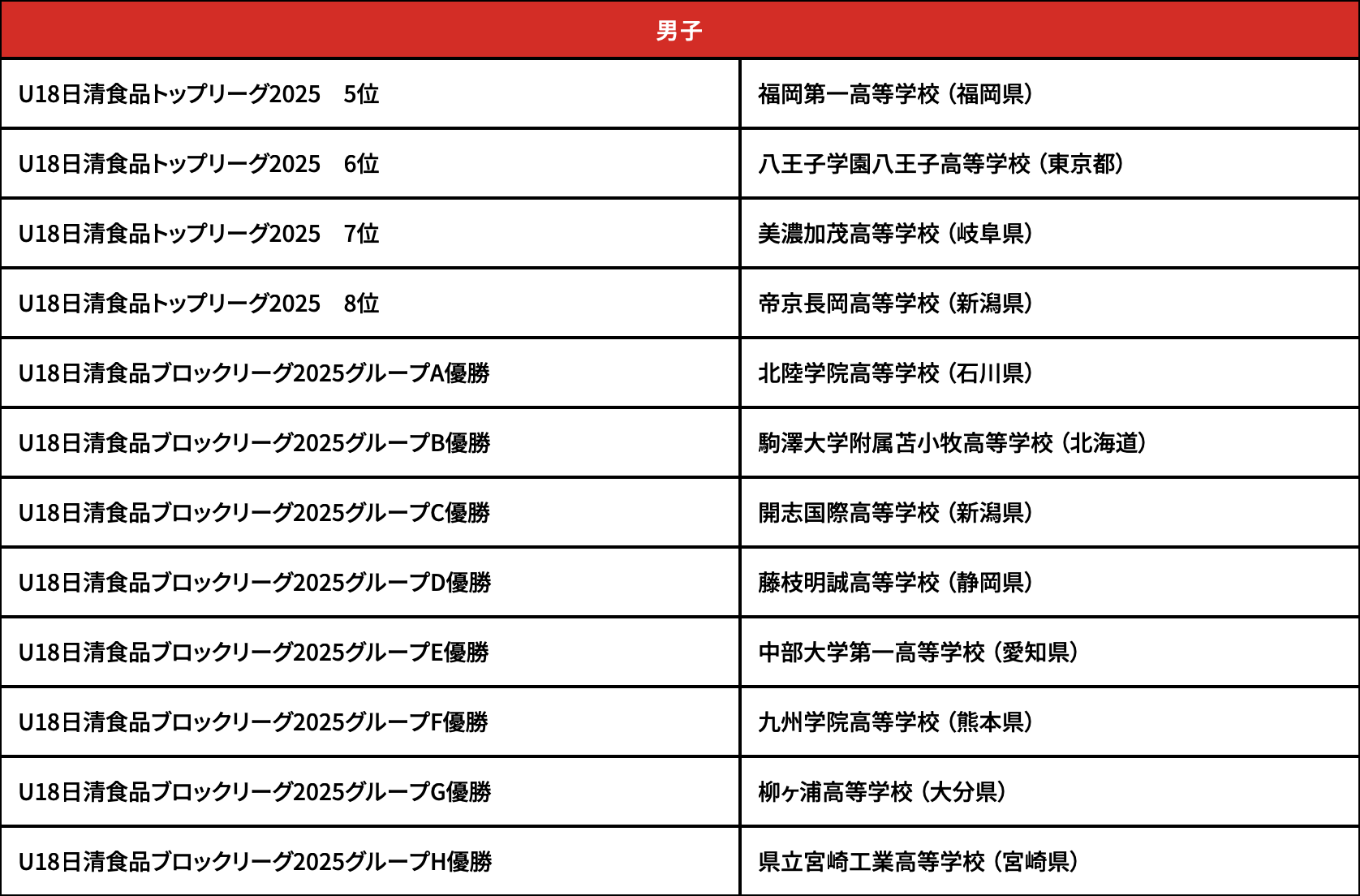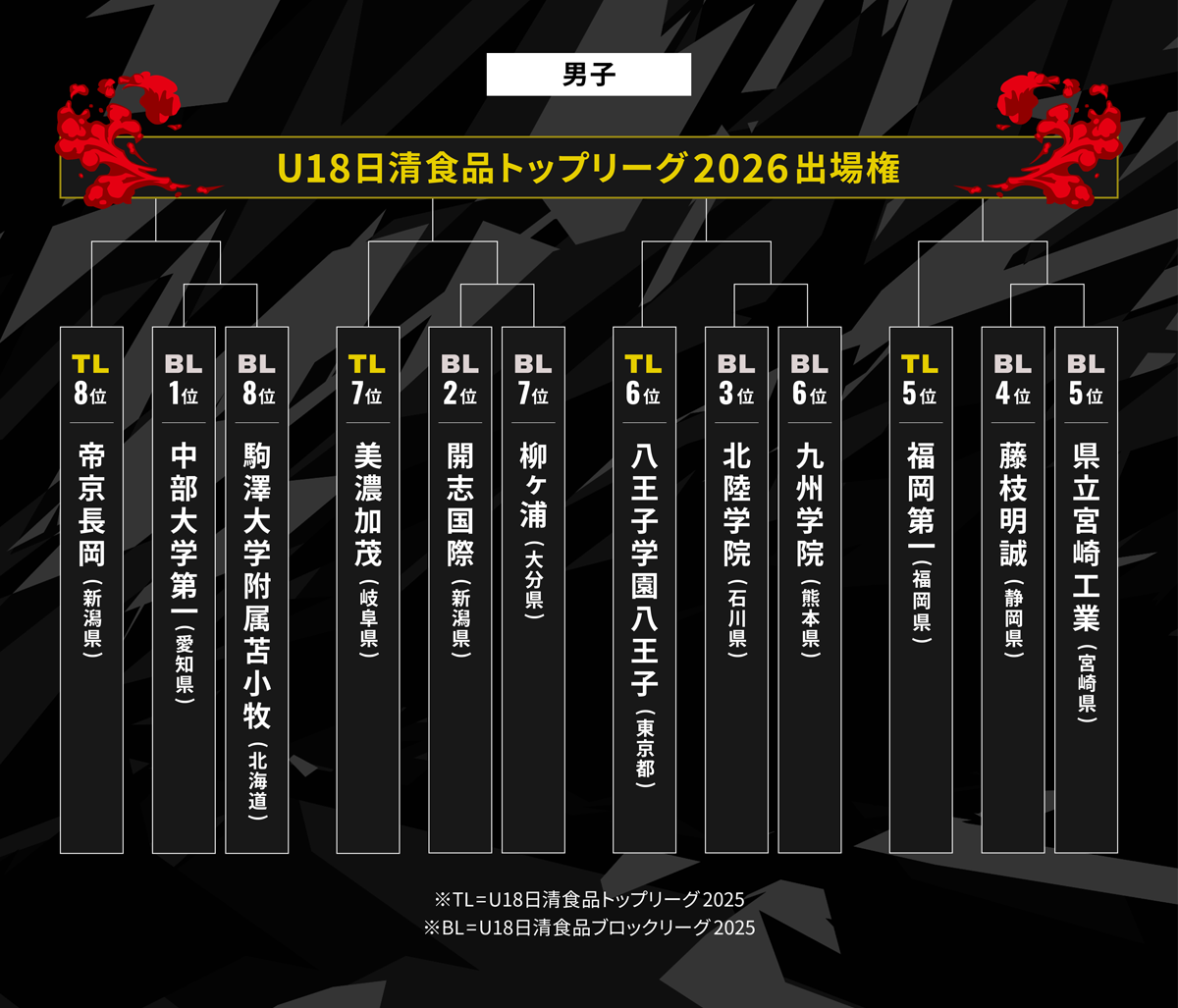 | 出場チーム | 「U18日清食品トップリーグ2026入替戦」 出場対象チーム男女各12チーム <出場対象チーム> 「U18日清食品トップリーグ2025」5位~8位(男女各4チーム) 「U18日清食品ブロックリーグ2025」 各グループ優勝チーム(男女各8チーム) |