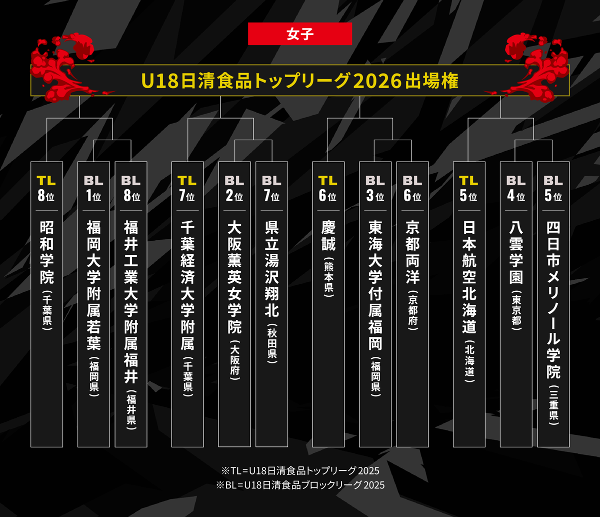 初開催の本大会では、2025年末に全国制覇を成し遂げた大阪薫英女学院のように男女ともに強豪が名を連ね、「U18日清食品トップリーグ」 への残留、復帰、初昇格を目指すチーム同士が最高峰の舞台への出場を懸けた激戦に臨みます。