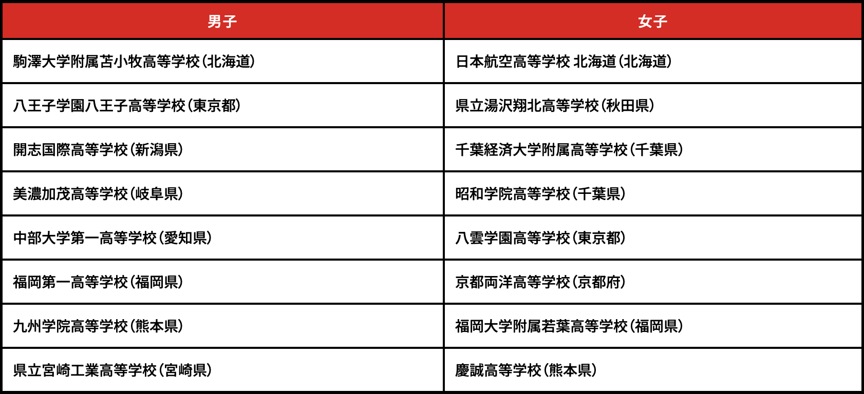 ※ほか男女各56チームは、各都道府県バスケットボール協会が男女各出場枠数分のチームを推薦する。ただし、従来の各都道府県インターハイ予選実績による推薦に限らず、B.LEAGUEクラブ U18チームおよびクラブチームへの出場機会を創出する「U18日清食品ブロックリーグ参入戦」などを導入し、部活/クラブなどの垣根を超えた環境づくりを図ることとする。