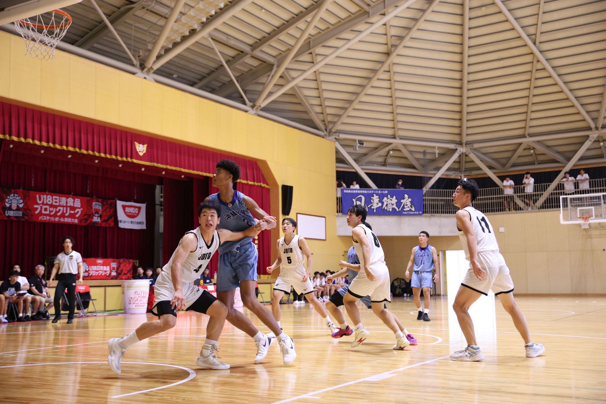 県立城東(徳島県)は、ここまで「U18日清食品ブロックリーグ グループG」の5試合を戦って全敗を喫しています。このチームで留学生とマッチアップするのはキャプテンの橋本翔汰選手。強靭な足腰で簡単には当たり負けせず奮闘しますが、182cmの身長ではディフェンスでもリバウンドでも高さの不利がどうしても出てきます。