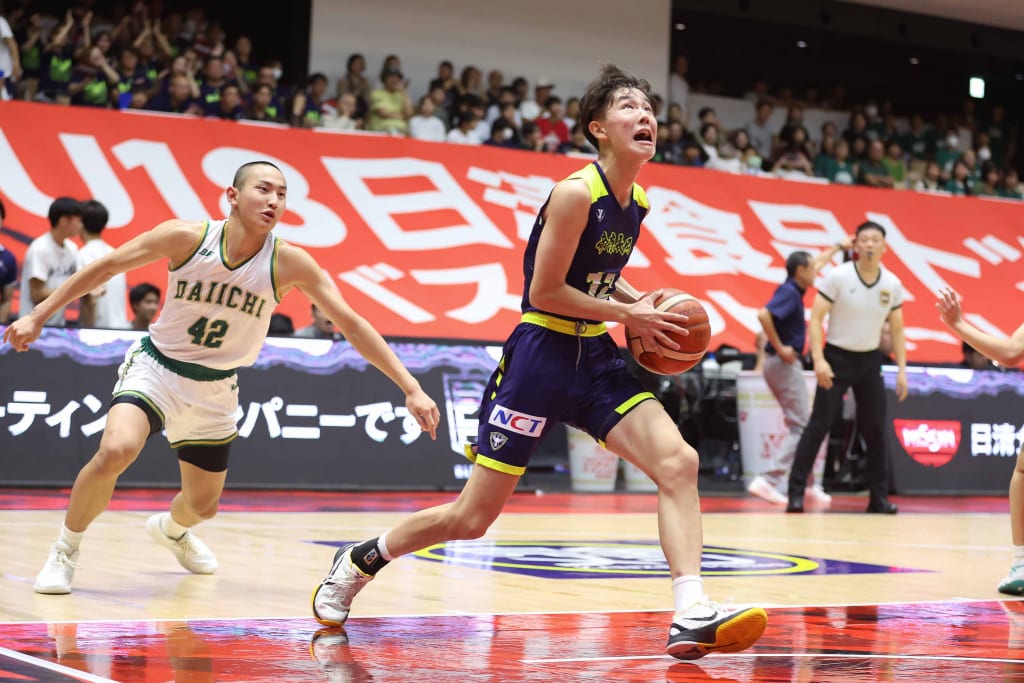 試合開始直後、帝京長岡は#15ジョベ パ マリック選手(1年/202cm)がバスケットカウント。その後も、マリック選手はゴールにアタックして得点しますが、福岡第一の#35宮本耀選手(3年/168cm)に3ポイントシュートを3連発で決められ、いきなり2桁差を付けられてしまいました。それでも帝京長岡は前日に「相手はディフェンスがタフなので、ミスをしても崩れず、声かけを徹底したいと思います」と決意を口にしていた#7赤澤翔心選手(3年/180cm)がダブルクラッチからのレイアップ、さらにフローターで加点。5点差として第2クォーターを迎えるとすぐに同点にします。赤澤選手がルーズボールにダイブするとベンチから出場した#12小笠原立騎選手(2年/184cm)も強度の高いディフェンスを展開するなど、気迫を全面に出してプレーする帝京長岡は、その後も一進一退の攻防を繰り広げ、44-42と2点リードを奪ってハーフタイムを迎えました。