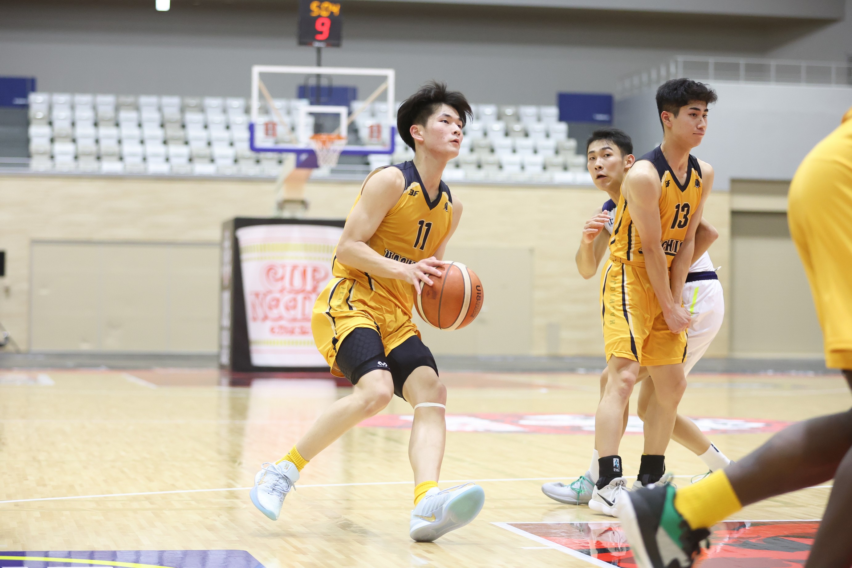 第2クォーターも早々に照井選手の3ポイントシュートが決まりますが、「エースシューターの照井選手と共に、自分も得点を取っていきたかった」という#11花島大良選手(3年/180cm)も積極的にオフェンスを仕掛けていきます。第2クォーター残り5分35秒にはバスケットカウントで3ポイントプレーを決め、40-27とその差を13点に広げました。その後も#13 畠山颯大選手(3年/174cm)のアシストから#8 ンジャイ パプ ンデリ セク選手(3年/206cm)がゴールを決めるなど八王子学園八王子のペースで試合は進み、53-36で前半を終えました。