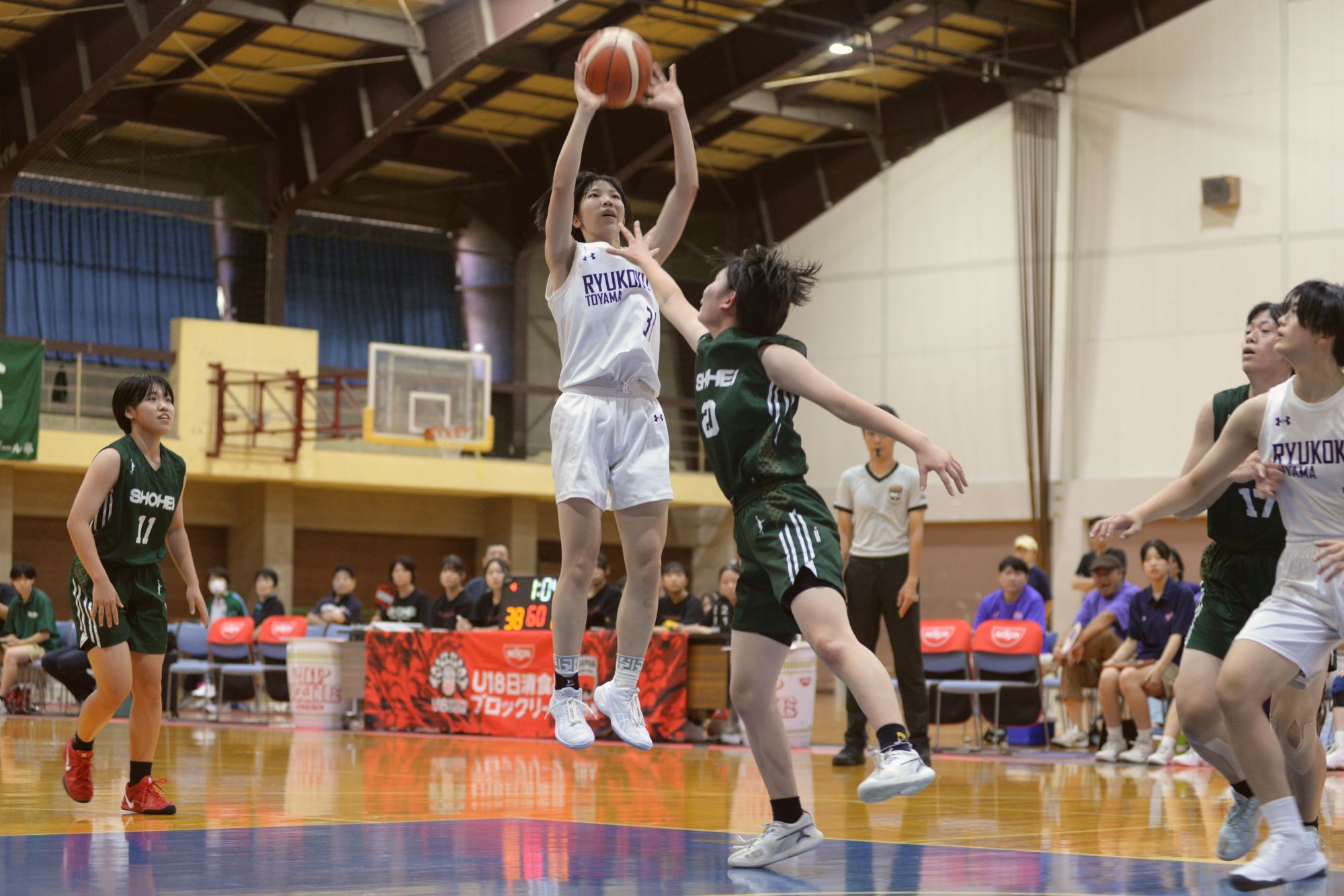 「U18日清食品ブロックリーグ グループC」を戦う龍谷富山(富山県)は、9月20日に自分たちの体育館でリーグ開幕戦を迎えました。2年連続2度目の出場とあって周囲の認知度も上がっているようで、佐藤肇コーチも「かなり注目されています」とうれしそうです。地元テレビ局が取材に訪れ、バスケ部以外の生徒、卒業生や保護者も多数応援に駆けつけました。