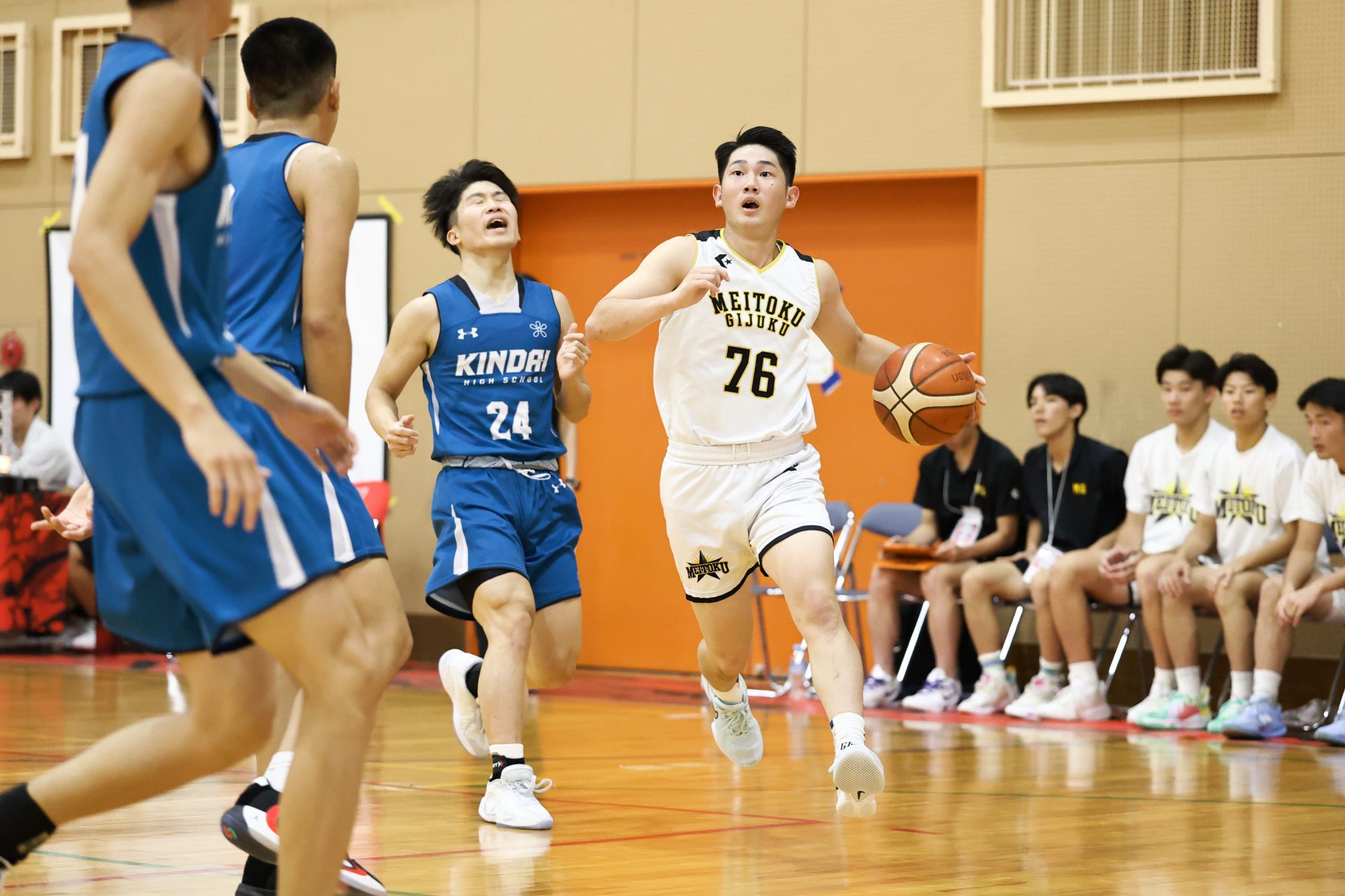 前半は互いに積極的なオフェンスからアップテンポなゲームを展開。明徳義塾はエース格の藤本翼選手や山田仁大選手らがゲームを組み立てつつ、留学生のオチェ アンソニー デイビッド選手の高さを生かした攻撃から得点を重ねます。加えて、足達アシスタントコーチが掲げる「得点の分散と攻撃バリエーションの増加」という狙いもコートで体現します。インサイドだけでなく、キックアウトからの3ポイントシュート、ドライブからのレイアップなど様々な形から得点を重ねました。