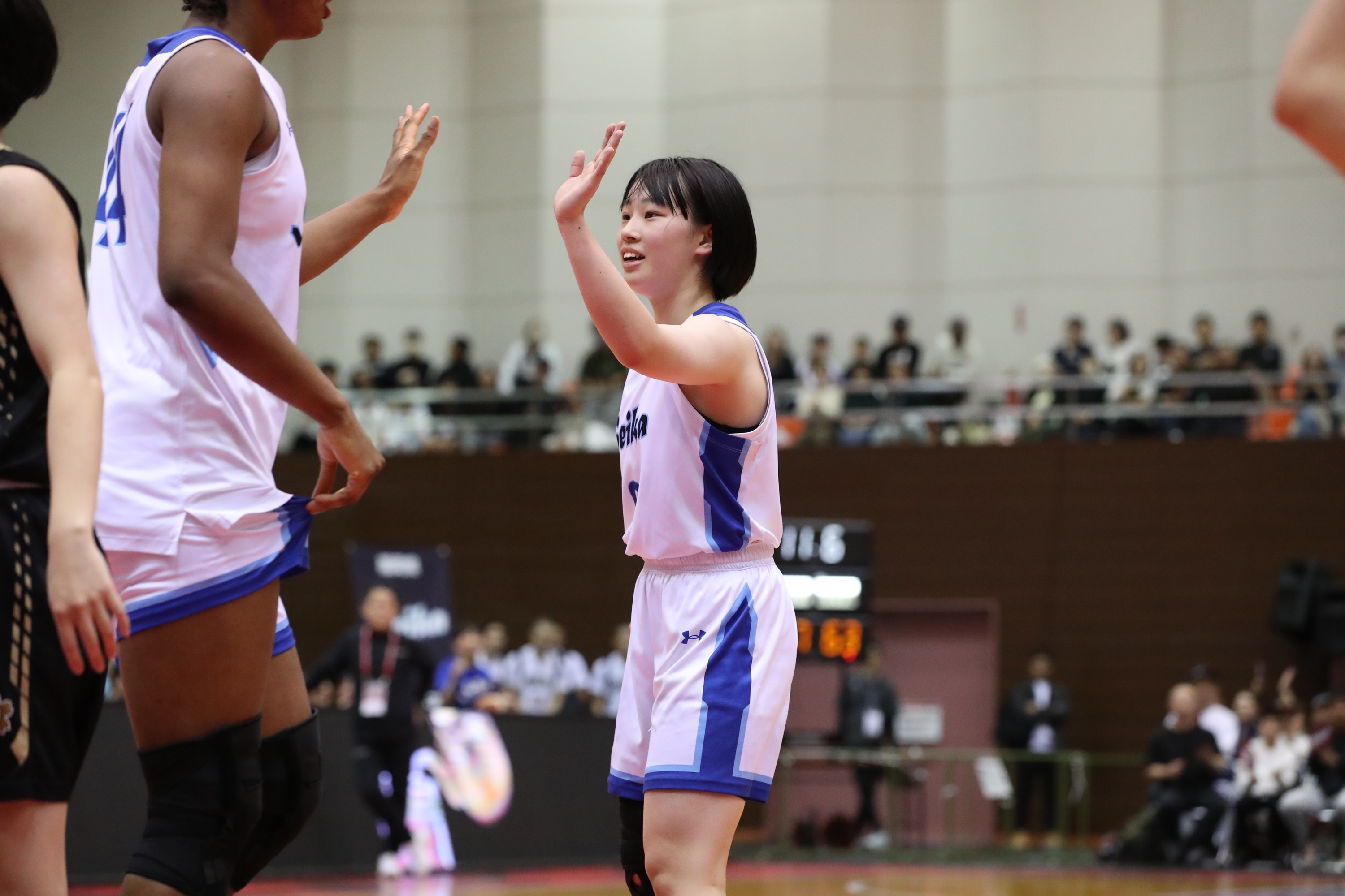 エジネ選手の得点で一時は逆転に成功しますが、「そこから何度も自分たちのミスが出て、シュートで終わることができなかった。そこでチャンスを失ってしまったと思います」と大上コーチ。結局、終盤はイシボ ディバイン選手(3年/177cm)らが連続得点を挙げた桜花学園に流れを奪われ、60-65で試合終了となりました。