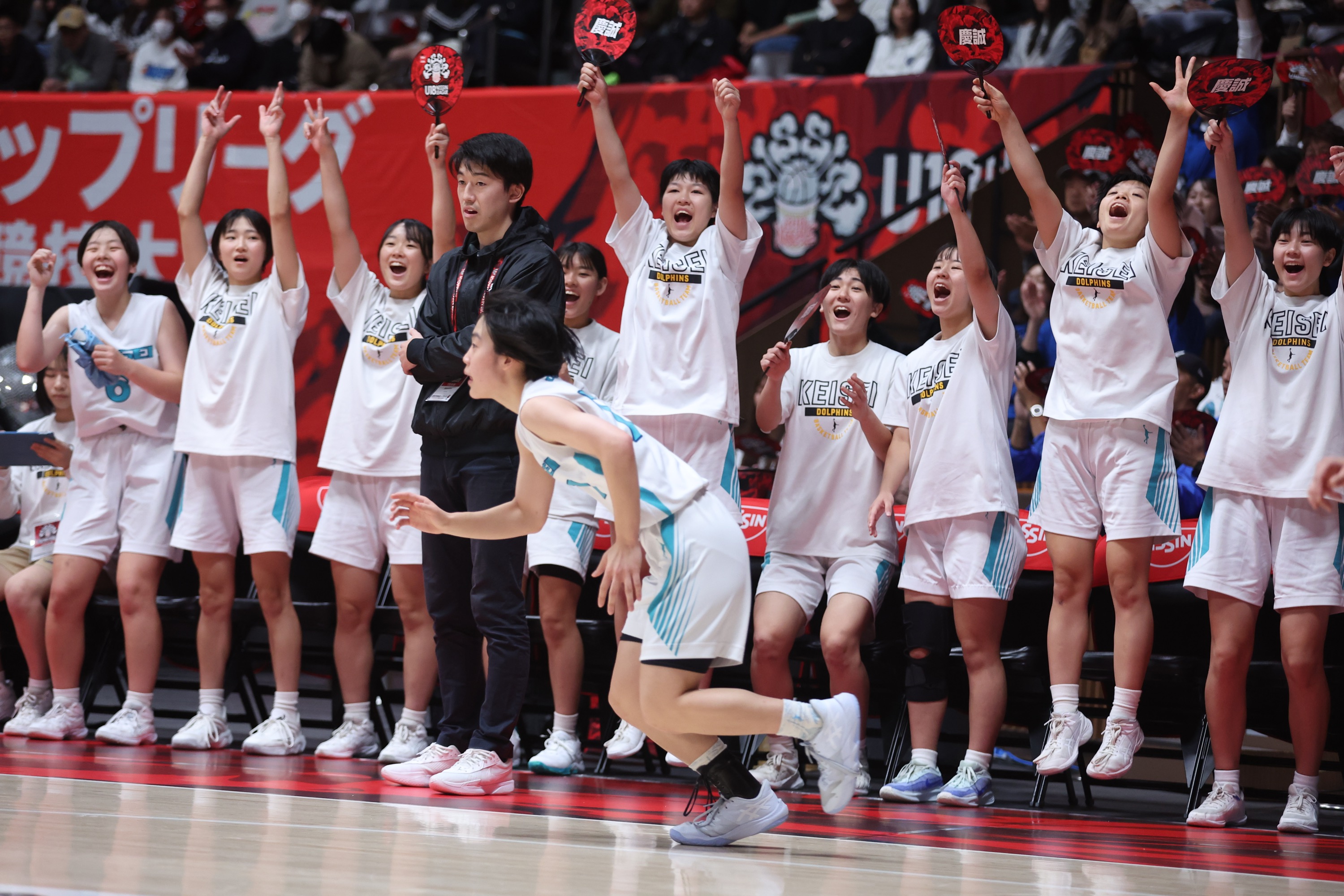 後半も、精華女子が逃げ、慶誠が追い掛ける展開が続きました。前半の点差そのままに第4クォーターに突入し、慶誠は#17澤田樹奈選手(3年/163cm)が攻撃を引っ張って逆転を狙います。しかし、この勝負どころで主導権を握ったのは精華女子。アイシャ選手がファストブレイクで得点を重ね、#7森田栞名選手(3年/160cm)や#9吉川愛未選手(3年/161cm)が3ポイントシュートで追撃しました。