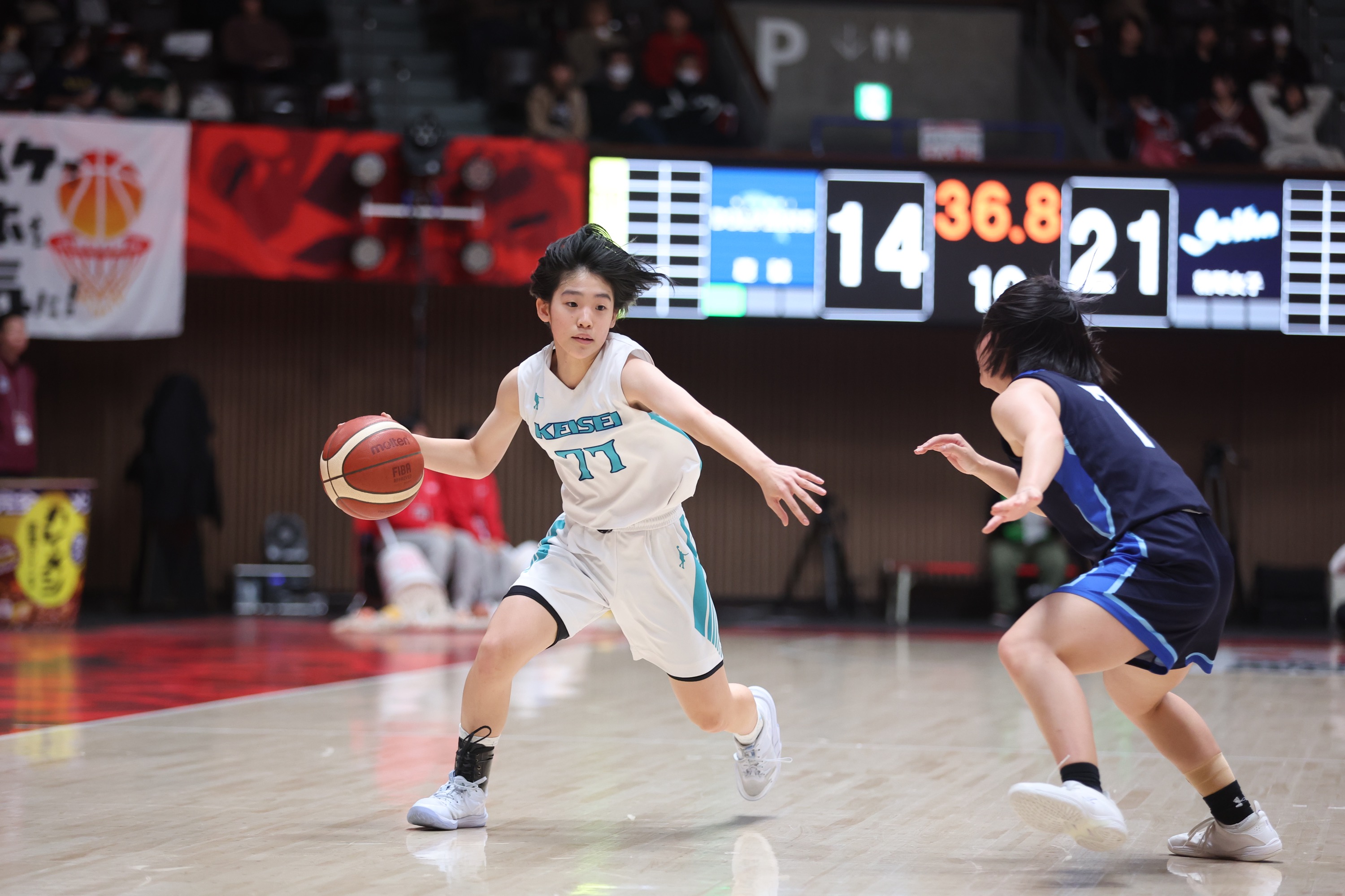 ただ、慶誠も黙ってはいません。14-23で入った第2クォーター、#77西本未来選手(3年/160cm)や#1陽本麻生選手(3年/170cm)の3ポイントシュートで息を吹き返し、開始4分には#24フェイバヘンリー選手(2年/184cm)のシュートで2点差に迫ります。そこからはきっ抗した展開。慶誠は逆転には至らず、32-39と7点ビハインドで前半を折り返します。