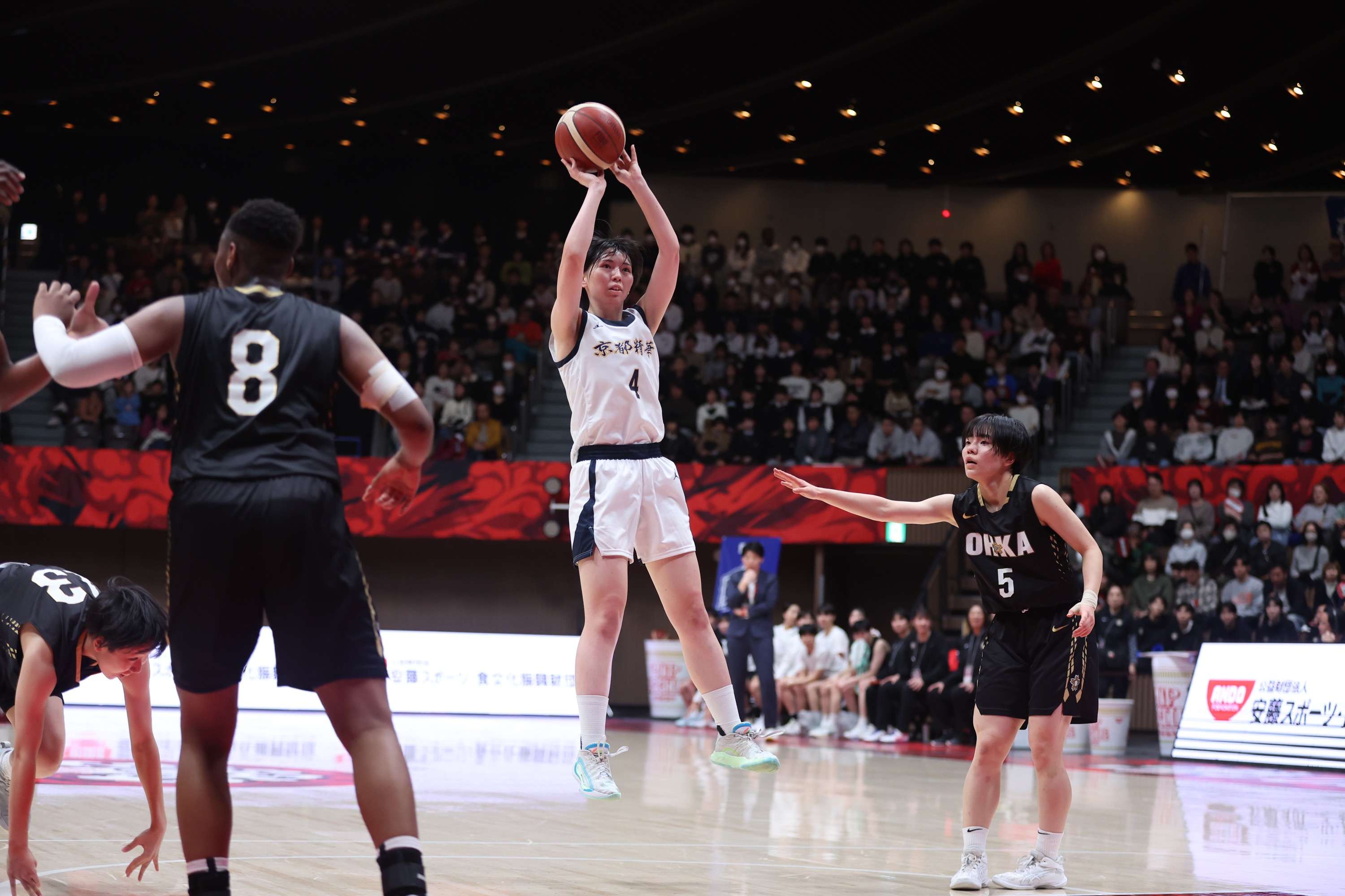 ただ、第2クォーター中盤から第3クォーターにかけて、桜花学園が反撃。#7勝部璃子選手(2年/177cm)が3ポイントシュートで流れを変え、途中出場の#5山田桜来選手(3年/160cm)が積極的なディフェンスで相手のターンオーバーを誘発。さらに#4濱田ななの選手(3年/161cm)が要所で3ポイントシュートを沈め、桜花学園がじわじわと追い上げます。