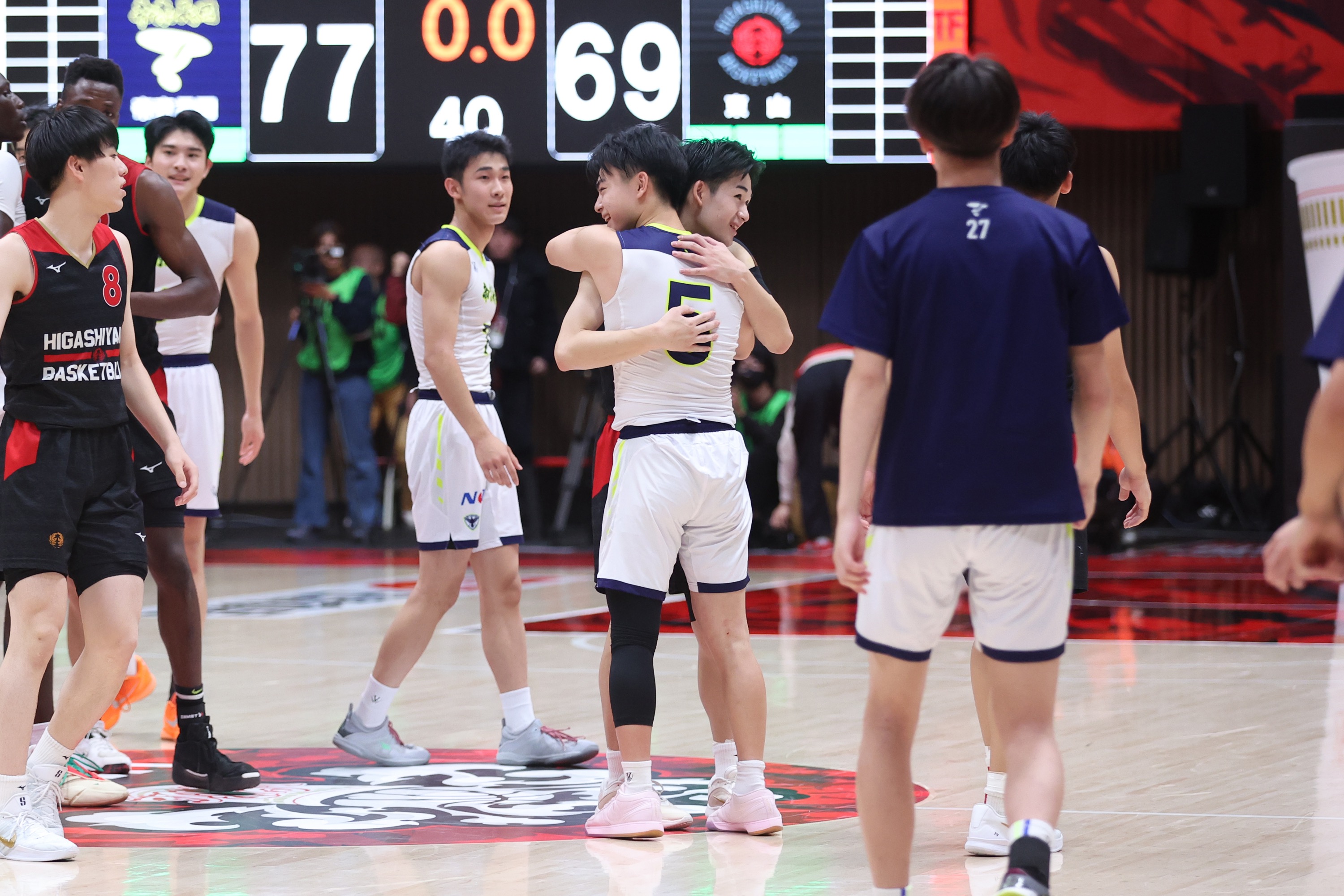 その後、東山は佐藤凪選手の個人技などで1点差まで迫りますが、帝京長岡も赤澤選手が要所で得点。さらに佐藤凪選手も意地を見せて得点を返すものの、なかなか追い付くことができません。帝京長岡は5点リードしていた残り44.9秒で、佐藤汰頼選手が勝負を決定付ける3ポイントシュートに成功。ファウルゲームを仕掛けてくる東山を振り切り、77-69で悲願の白星をつかみました。
