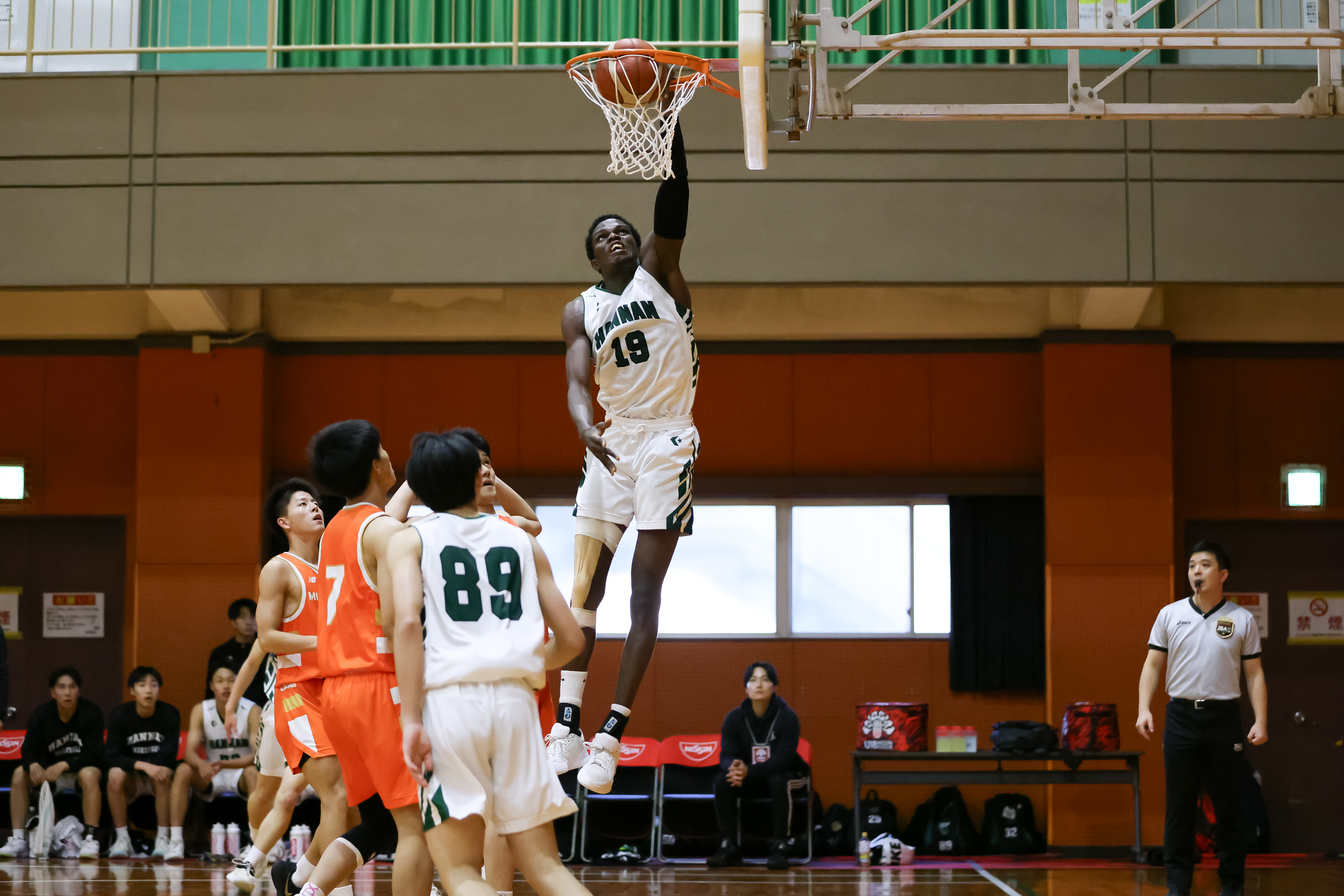試合が始まると、阪南大学はイベアブチ エマニュエル チジオケ選手の200cmの高さを生かしてゴール下を狙いつつ、周りの選手たちも前が空いたら果敢にリングにアタックして接戦を繰り広げます。第4クォーターを52-55で迎え、その後も県立宮崎工業に食らい付きましたが、最後は63-71で敗れ、優勝を逃しました。