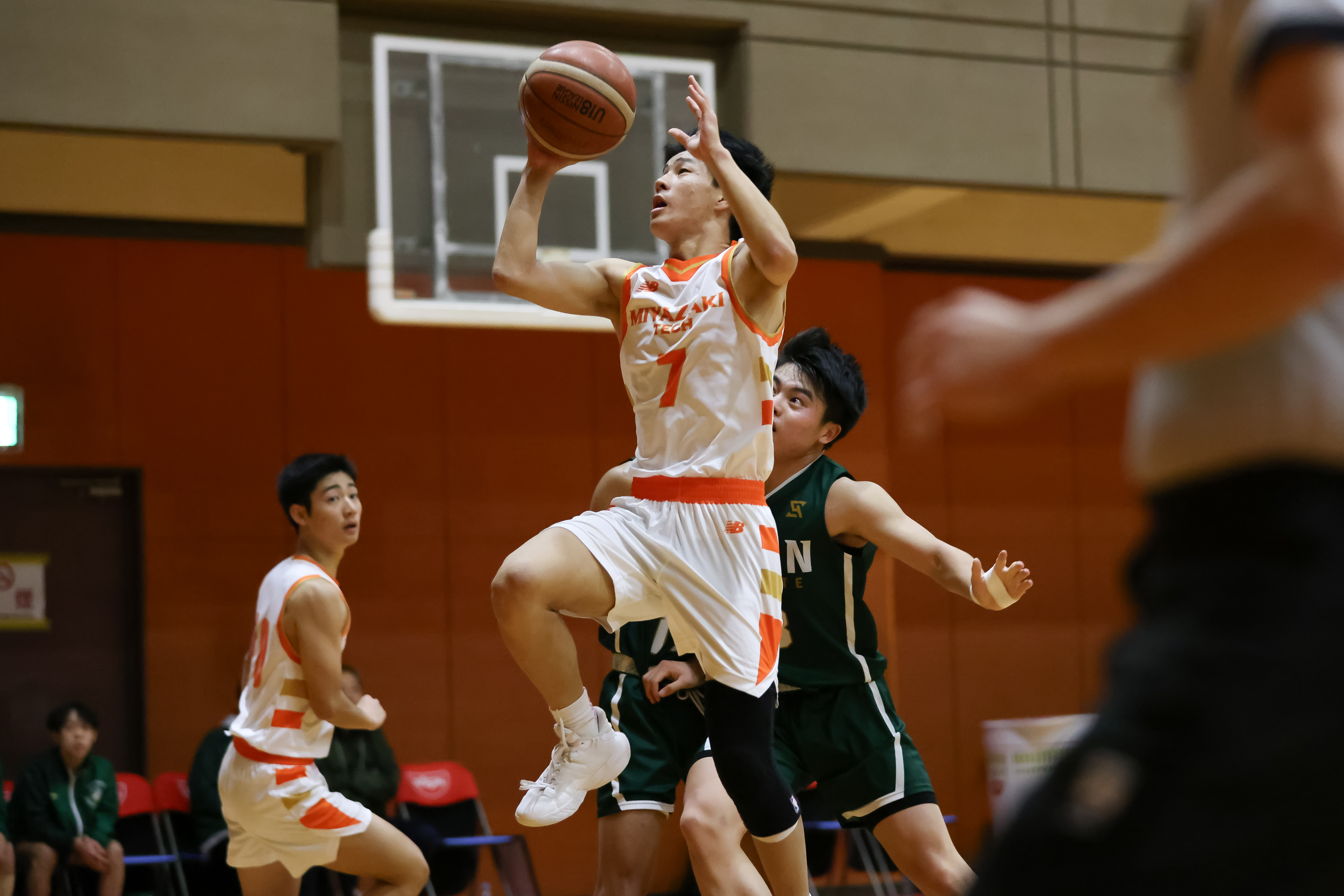 阪南大学戦は立ち上がりで身長200cmのイベアブチ エマニュエル チジオケ選手の高さに苦戦しつつも、持ち味の攻撃的なディフェンスからの速いバスケで高さの不利を補い、一進一退の攻防に持ち込みます。3点リードで迎えた第4クォーター、リバウンド争いではボックスアウトを徹底し、オフェンスではチームでスペースを作っては3ポイントシュートを沈めて、最終スコア71-63で勝利しました。