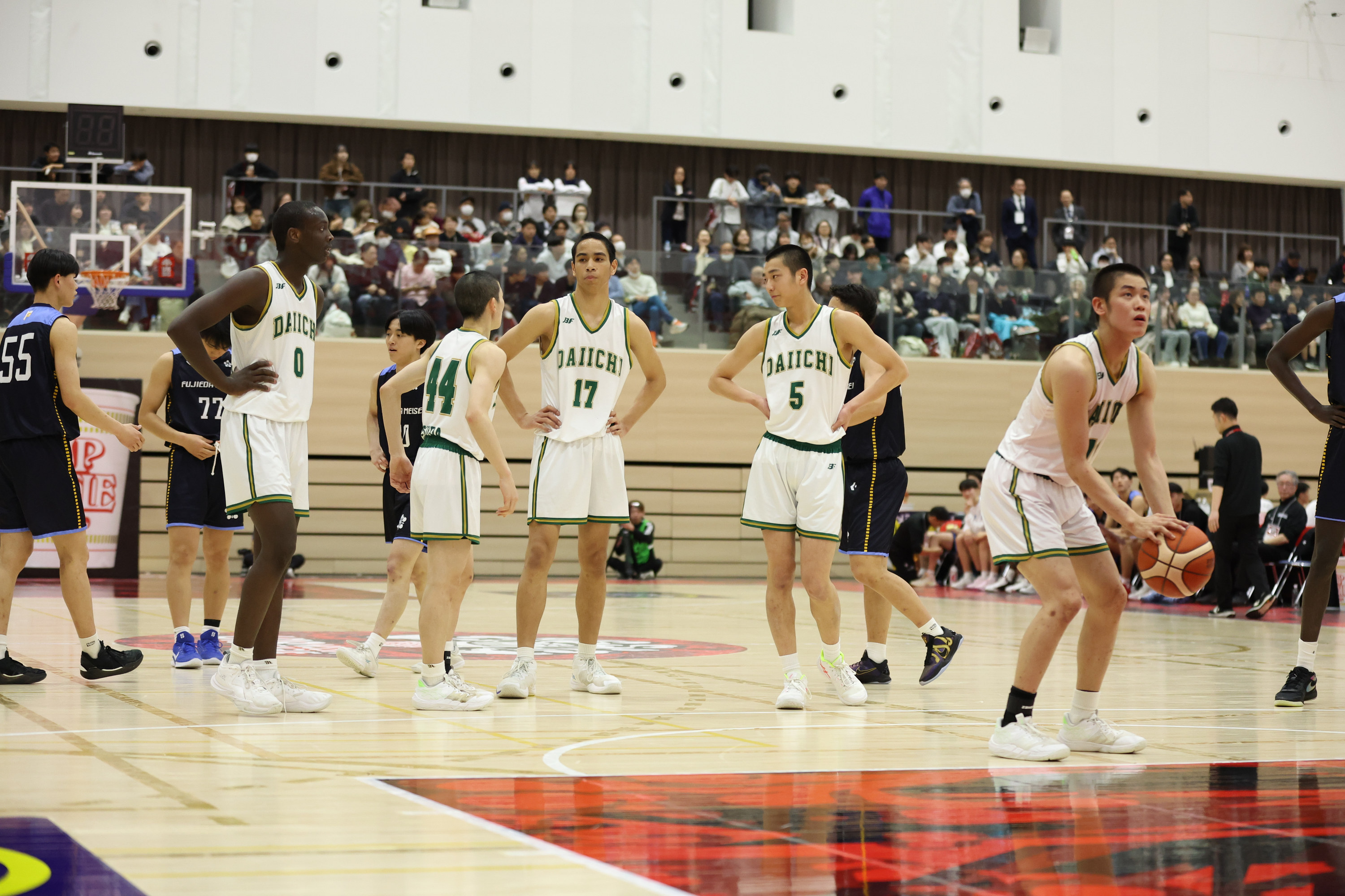 試合は序盤から、なかなか点差の離れない展開となりました。守り合いのロースコアゲームが続く中、福岡第一は#16 ソップ・ハンソン選手(2年/197cm)の得点でリードしますが、藤枝明誠も大きくは離されずに食らい付きます。第2クォーター、前から激しいディフェンスを仕掛けて相手のターンオーバーを誘った福岡第一が23-13と10点リードに成功。ただ、藤枝明誠のシックスマン#26 山城空楽選手(2年/cm)に3Pシュートやバスケットカウントを許し、同点に追い付かれます。