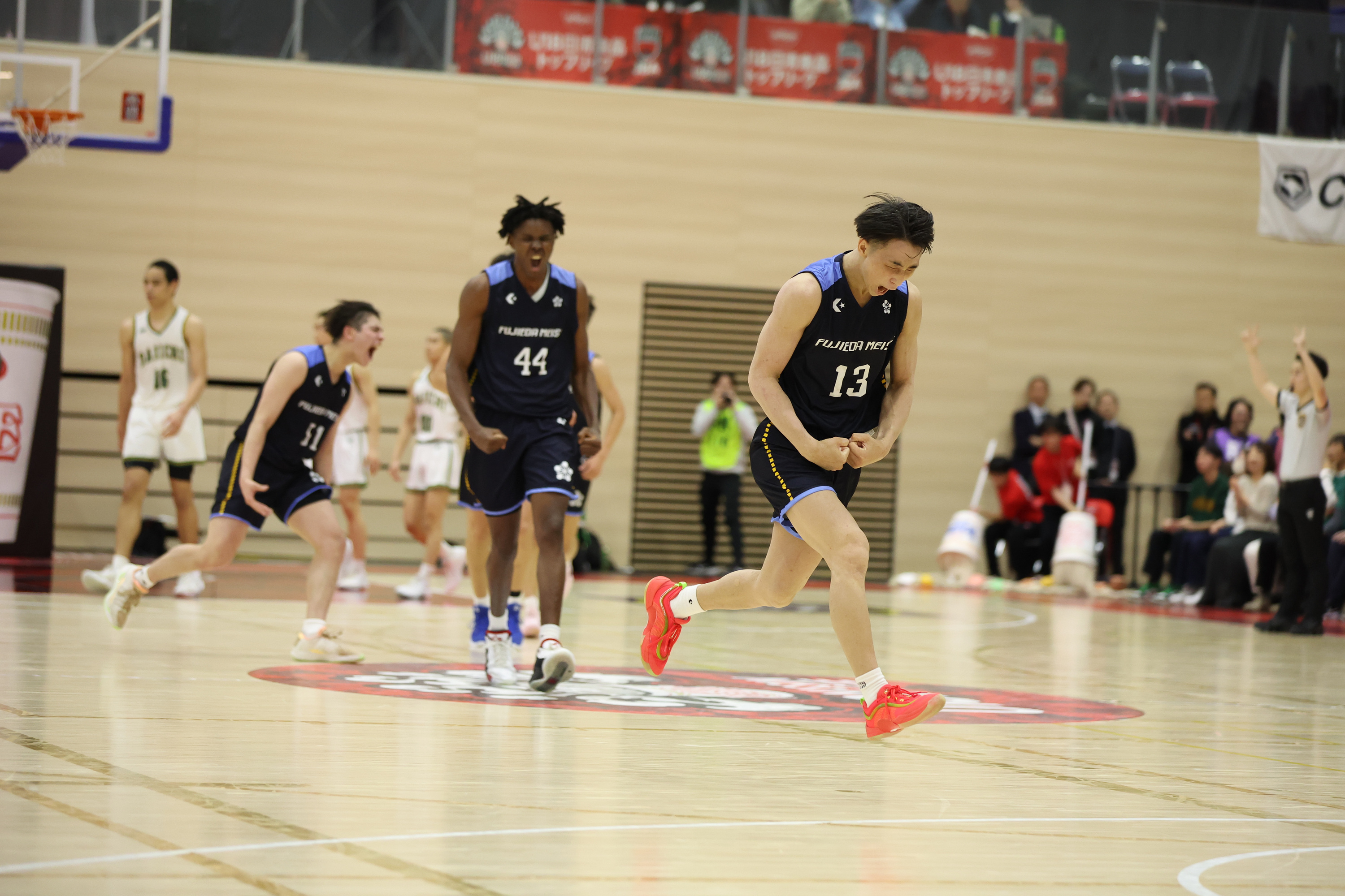 この間、#76 南里選手が得点面で活躍を見せ、福岡第一が残り7分を切って9点リード。このまま福岡第一が試合を優位に進めるかと思われましたが、クォーター後半から流れが一転します。内外角からシュートを決めてくる藤枝明誠に反撃を許し、「受け身に回ってしまった」(#76 南里選手)という福岡第一。藤枝明誠はクラッチタイムに強いエースの#13 渡邊選手が、残り1分25秒で同点の、残り24秒に逆転の3ポイントシュートをそれぞれ決めて勝負あり。62‐59の逆転勝利で、「U18日清食品トップリーグ2026」の出場権を獲得しました。