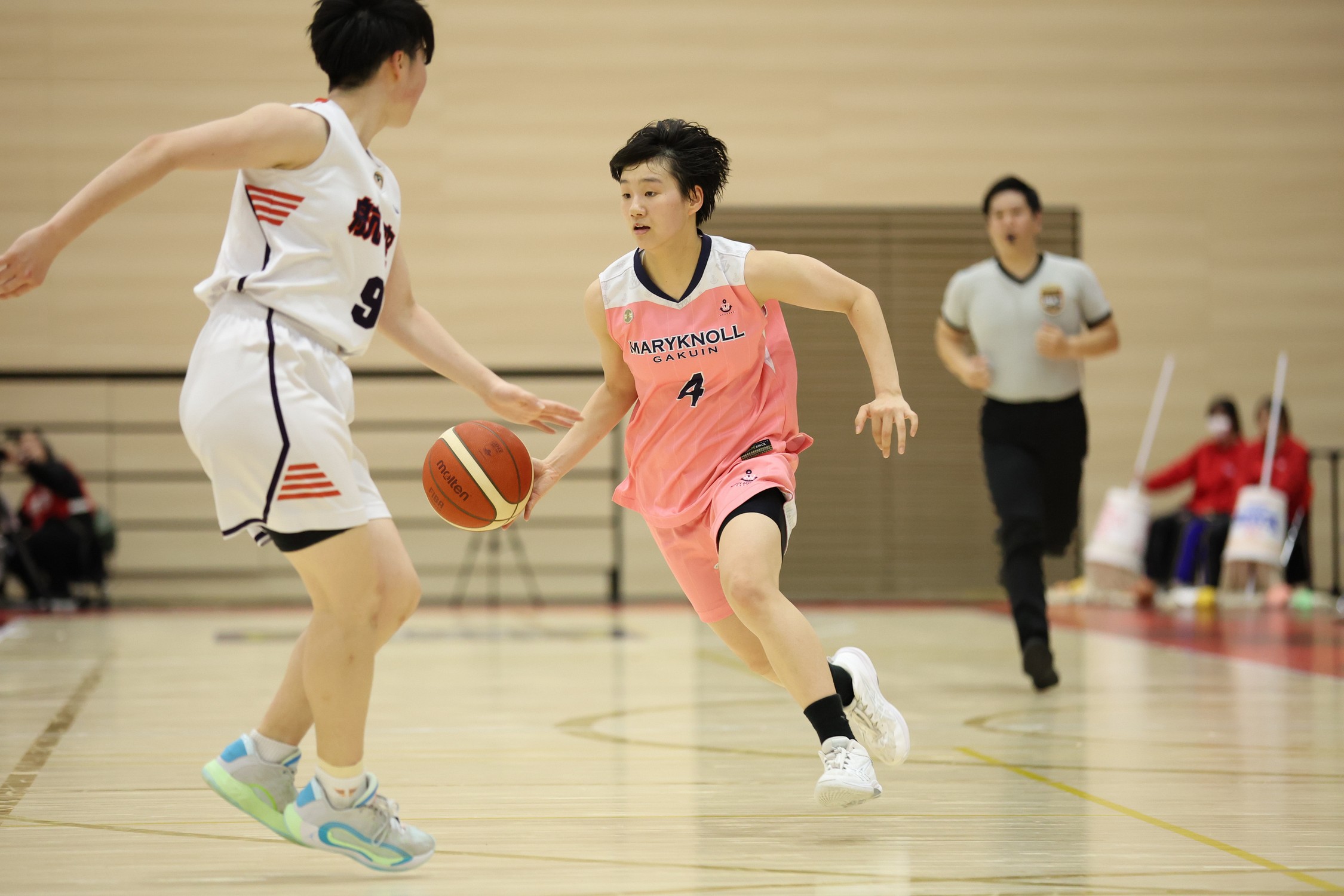 後半に入っても、四日市メリノール学院が優位に試合を進める中、日本航空北海道は#5 岡崎永奈選手(154cm/1年)、#9 藤田優海選手(167cm/1年)らの得点で盛り返していきます。しかし、第3クォーター終盤に入ると、四日市メリノール学院の#16 小林蘭選手(175cm/1年)が存在感を見せます。第3クォーターを68-50とリードを広げて終えると、続く最終クォーターでも流れを相手に譲ることなく、91-70で快勝しました。